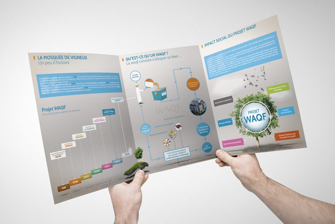L’idée est d’orienter durant ces quatre jours la communication du Projet Waqf sur la notion de Waqf et faire en sorte que le Projet Waqf soit à la périphérie, tant au niveau du discours qu’en terme d’image (stand). Le concept est de promouvoir à travers un parcours en 4 étapes le principe du Waqf.