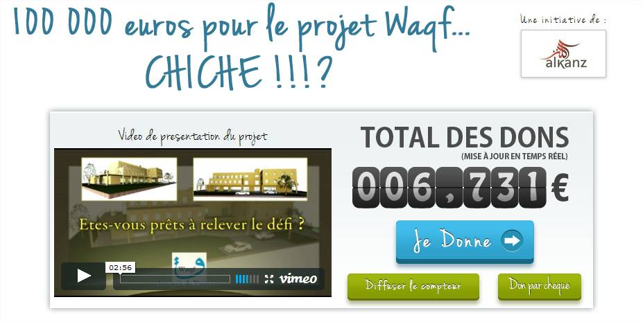 Dans le cas du site Al-Kanz et du projet Waqf, le but est d’obtenir 100 000 euros. Pour cela,  un micro site a été réalisé pour cette opération.  Cette page web contient un module de paiement  avec un compteur qui s’incrémente automatiquement à chaque don et ceci en temps réel.