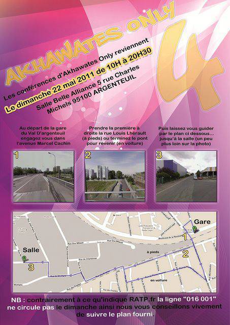 Les Akhawates vous connaissez ? nous vous en parlions en 2010 dans les musulmanes communiquent. C’est un groupe de femmes qui organise des rassemblements dédiés exclusivement aux femmes. Elles reviennent pour une 4e édition dans le but de rassembler un maximum de personnes. Cette nouvelle rencontre sera placée sous le signe de la science. Elle aura lieu le dimanche 22 mail 2011 de 10h à 20h30 à la salle Belle Alliance à Argenteuil.