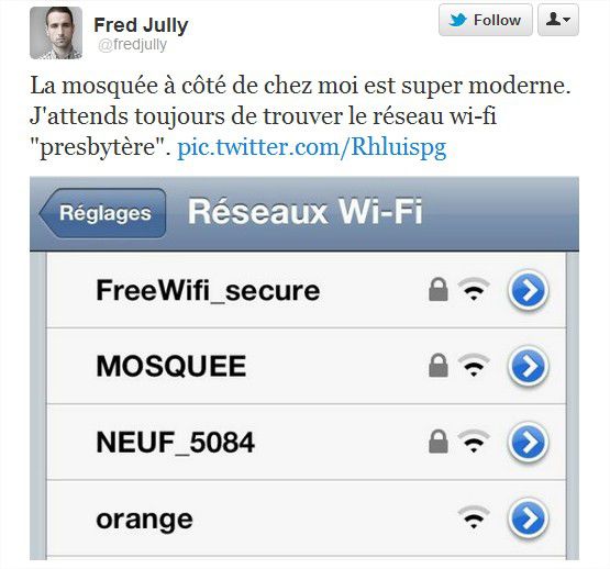 Certaines mosquées en France font en sorte de ne pas être dépassées par les nouvelles technologies, jusqu’à offrir un service de connection internet wifi à leurs fidèles. @FredJully découvre que la mosquée à côté de chez lui dispose d’un réseau wifi baptisé « mosquée ».