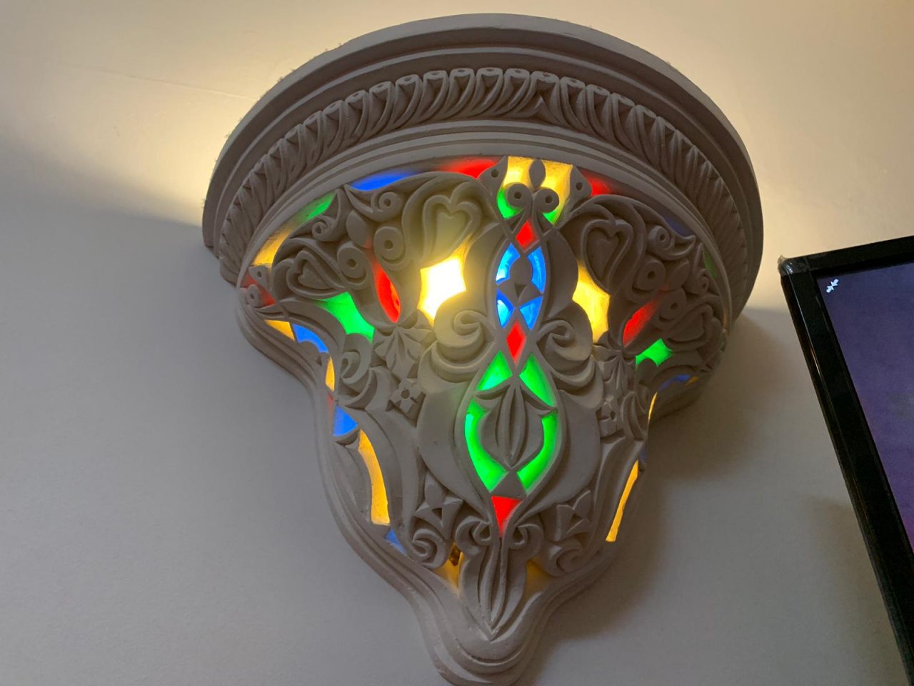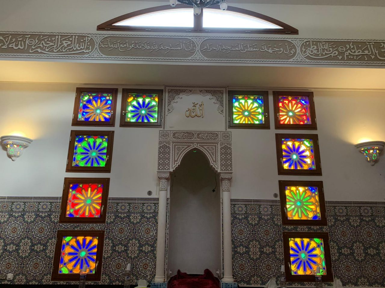 Le mihrab est entouré de magnifiques vitraux colorés qui sont eux illuminés par la lumière du jour.