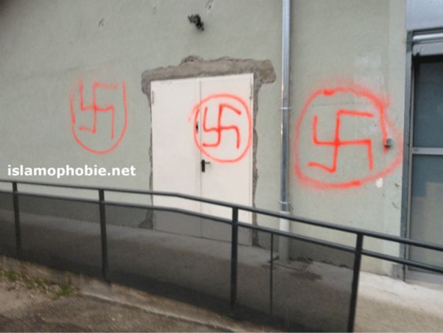 A Voiron, dans l’Isère près de Grenoble, les murs de la mosquée ont été tagués de plusieurs croix gammées.
