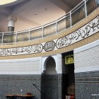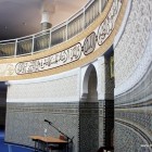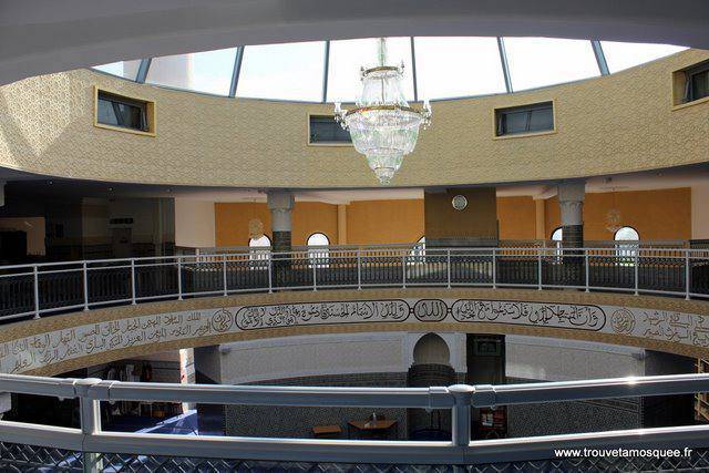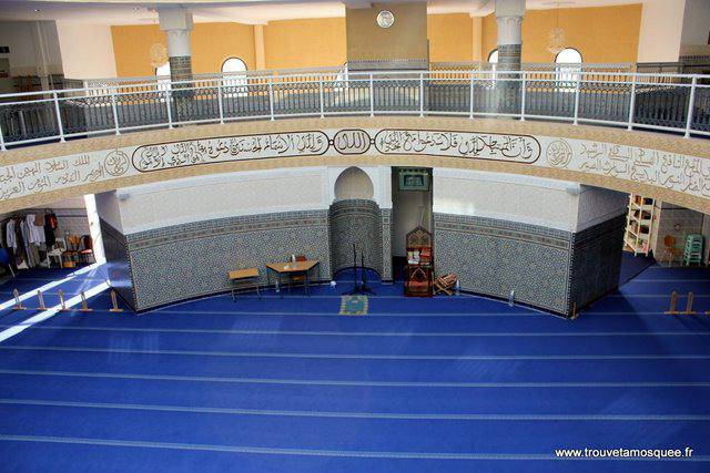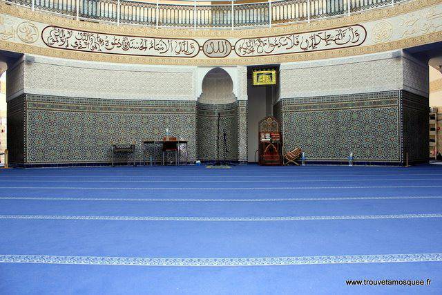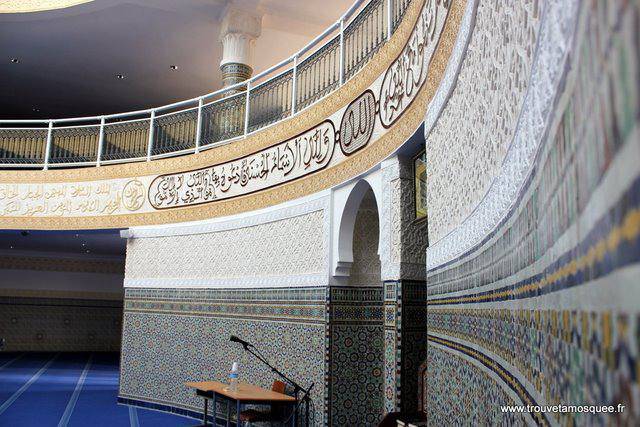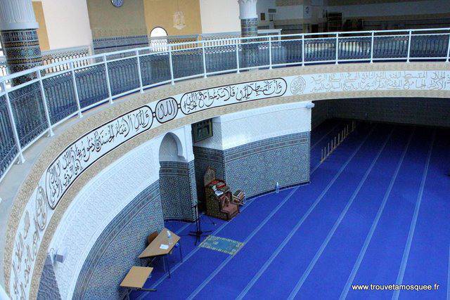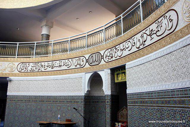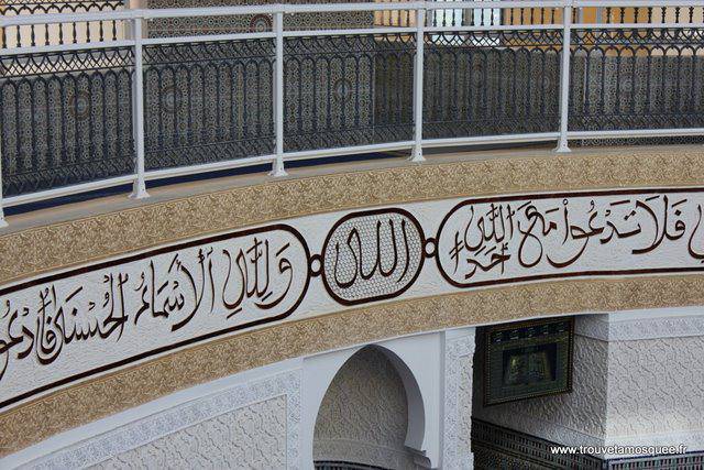 Si vous avez l’occasion de visiter cette mosquée, vous serez impressionnés par  l’imposante salle de prière, au rez-de-chaussée, assez grande pour accueillir jusqu’à 1500 fidèles. Le mur du Mihrab est courbé et  décorée par une large calligraphie. Des artisans français ont réalisé cette décoration de Nakch (revêtement en plâtre sculpté très présent dans les mosquées du Maghreb), une œuvre dont la complexité et la beauté forcent l’admiration.