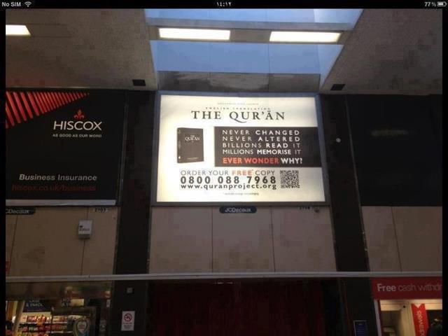 En Angleterre, le Coran s’affiche en grand. On peut lire sur un 4×3 :