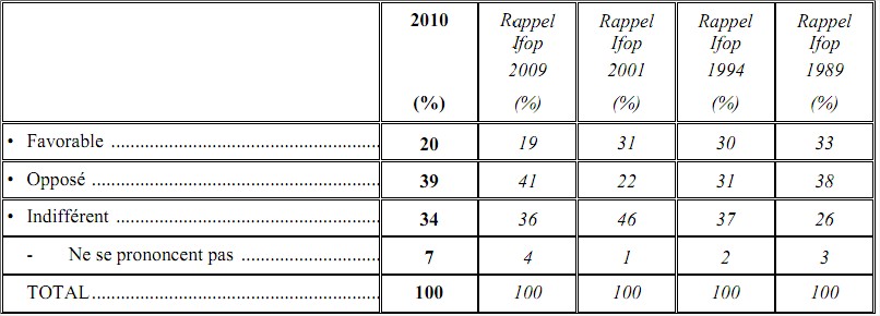 En décembre 2010 l’Ifop et Le Monde avaient publié un sondage similaire. La question posée était « Etes-vous favorable, opposé ou indifférent à l’édification de mosquées en France lorsque les croyants le demandent ? »