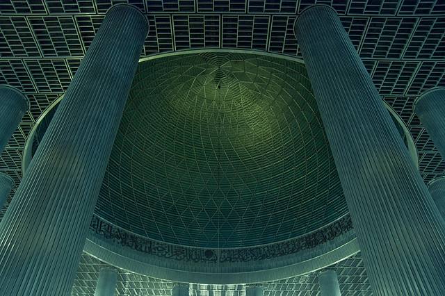 Le bâtiment principal rectangulaire est la salle de prière, elle est couverte par un dôme de 45 mètres de diamètre. La coupole est soutenue par douze colonnes rondes recouvertes de plaques d’aluminium. La salle de prière est entourée par des piliers rectangulaires portant quatre niveaux de balcon. Des escaliers aux quatre coins de l’édifice donnent accès à tous les étages. Le hall principal est aussi couvert par un dôme de 10 mètres de diamètre. L’unique minaret surplombe la mosquée à 90 mètres de hauteur.