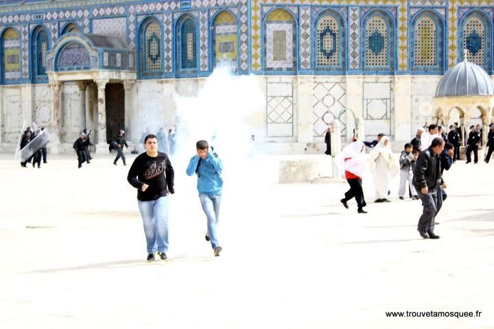 Nous nous trouvions sur l’Esplanade des Mosquées à al Qods (Jérusalem) pour la prière du vendredi. Environ 15 min après la fin de la prière, nous avons entendu un énorme bruit d’explosion et nous avons vu des policiers de l’occupation israélienne entrer en file indienne sur l’Esplanade, armés jusqu’aux dents: flashball, pistolets, taser, grenades assourdissante… Ils se sont précipités devant la porte du Dôme du Rocher (Qubbat as-Sakhra) où les femmes venaient d’accomplir leur prière, et leur ont assené de violents coups de matraque. Ils ont également lancé une grenade assourdissante sur elles, mais elle n’a pas explosé. Un des hommes a reçu un coup sur la tête – j’ai encore à l’esprit l’image de son sang qui coulait sur les escaliers – et a été évacué d’urgence par le croissant rouge. Le grand mufti de Jérusalem, Mohammed Hussein, a également été évacué d’urgence et mis à l’abri dans un petit local se trouvant sur l’Esplanade. On pouvait entendre des bruits d’explosions de grenades assourdissante qui étaient tirées dans tous les sens par la police d’occupation israélienne dans l’objectif de disperser les fidèles, et plongeaient ainsi l’Esplanade sous un nuage de fumée. Une grenade a même explosé à notre proximité. Les policiers poussaient brutalement les Palestiniens (même les femmes). Une Afro-Palestinienne qui se tenait à nos côtés était en pleurs, une autre femme hurlait de tristesse et de rage… Je ne comprenais pas ce qu’elle disait (elle criait en arabe) mais j’ai senti comme un appel au secours.