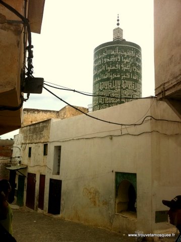 Paré de faïences vertes et calligraphié de versets du coran de couleur blanche, ce minaret, rare, s’érige vers le ciel depuis une embase cubique. Presque invisible de l’intérieur des ruelles en altitude de la ville de Moulay Idriss zerhoun, au Maroc, il se situe à proximité du sanctuaire d’Idriss Ier. Cette mosquée atypique a été érigée en 1939, par Haj Mohamed Sentissi.