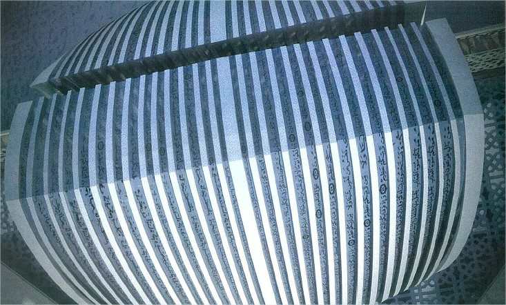 Vue de l’intérieur, on remarque les versets coraniques sur les parties en verre du dôme.