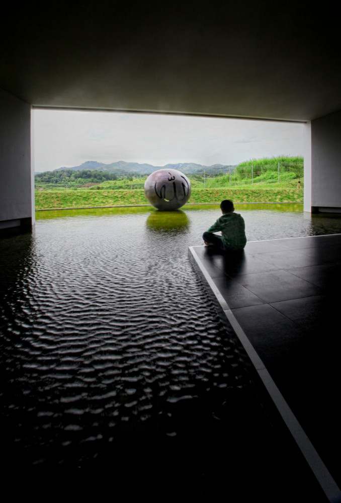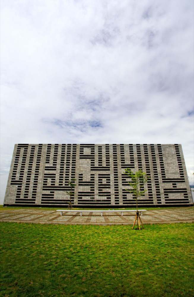 Le mihrab est inexistant dans cette mosquée. Les fidèles, lors de la prière, ont une vue sur l’étang et une pierre, gravée d’une calligraphie « Allah », qui semble flotter sur l’eau.